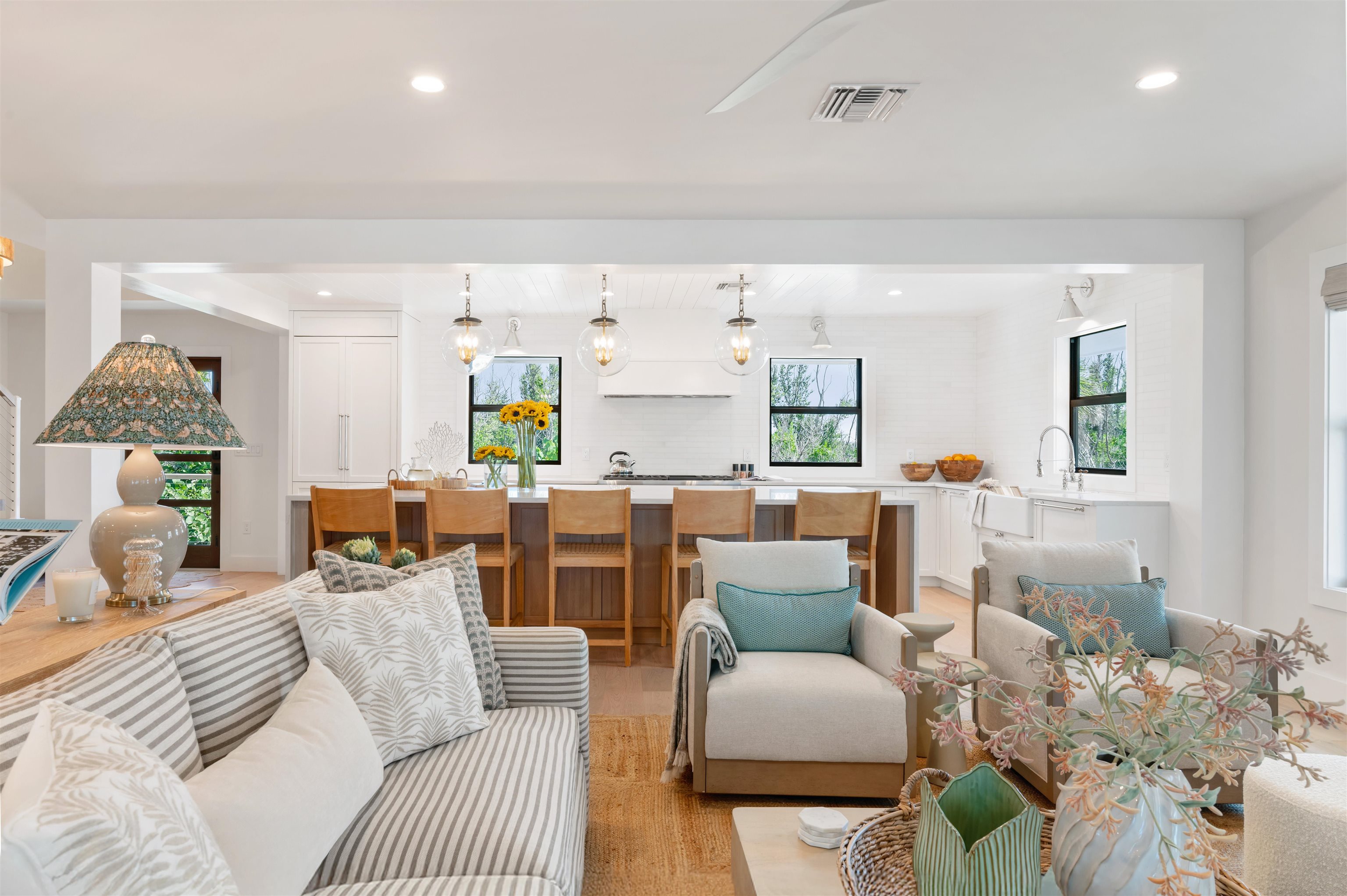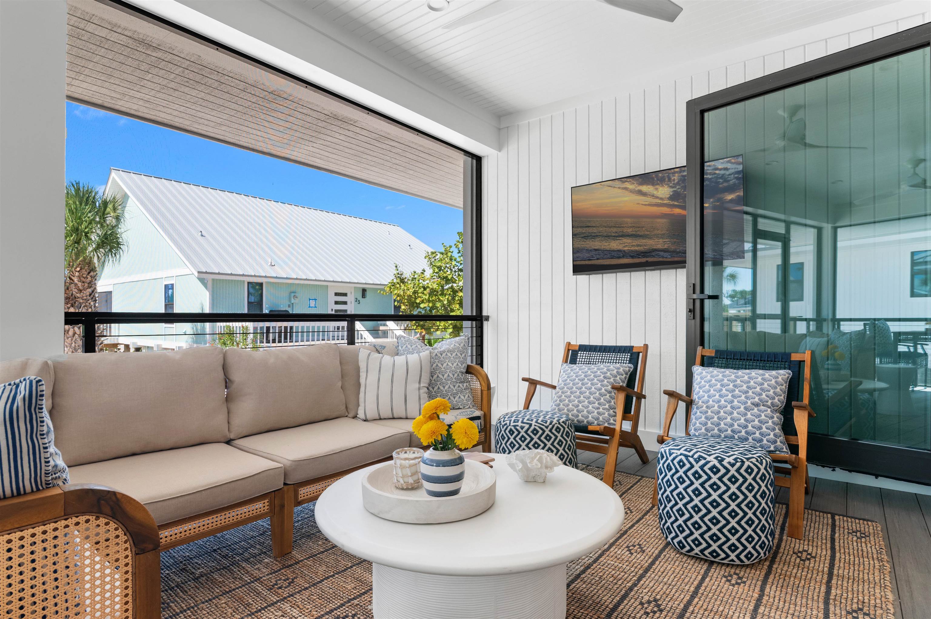 Welcome to Beach Home 24, a stunning coastal retreat that has been completely renovated, reconfigured, and expanded to just under 2,400 square feet. This 4-bedroom, 4.5-bath residence showcases a one-of-a-kind floor plan with direct Gulf views and a design that perfectly balances modern sophistication with the relaxed charm of Captiva Island. Professionally designed and furnished, every detail has been thoughtfully curated to elevate comfort and style within the exclusive South Seas Resort. The designer kitchen serves as the heart of the home, featuring an impressive 11’+ island, Vadara Sereno Gold Quartz countertops, honed marble tile backsplash, and top-of-the-line Thermador appliances including a panel-front built-in refrigerator and 48†Pro Harmony gas range. An adjoining bar area enhances the home’s entertaining appeal, complete with Zephyr panel-front fridge drawers, built-in wine fridge, and brass sink. Each of the four bedrooms offers a private en-suite bath, providing comfort and luxury for family and guests. The main level hosts a primary suite, junior suite, and twin suite, while the upstairs primary suite presents a serene retreat with a walk-out sun deck capturing sweeping Gulf views. Bathrooms are finished with mosaic marble tile flooring, honed marble shower walls, and thermostatic shower systems with body sprays. Additional highlights include engineered hardwood flooring, shiplap and board-and-batten accents, impact-rated windows and doors, and a brand-new 2025 standing seam metal roof. With timeless coastal décor and unparalleled craftsmanship, Beach Home 24 embodies the essence of Captiva Island luxury living—offering elegance, comfort, and breathtaking Gulf vistas.